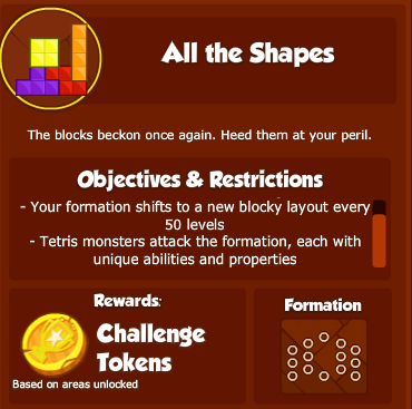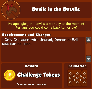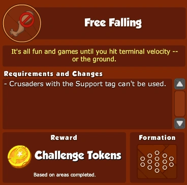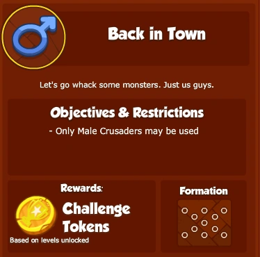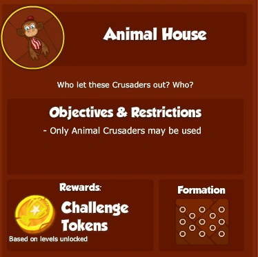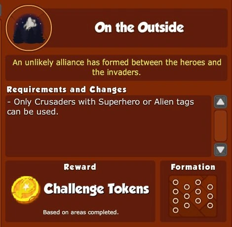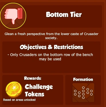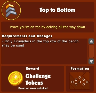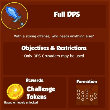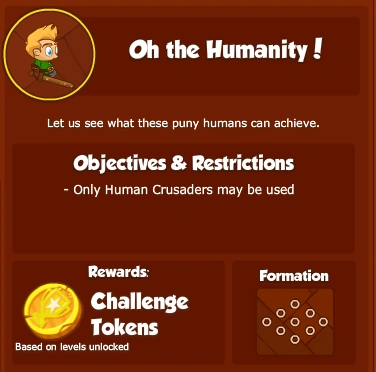 What are Challenges? Challenges are limited-time objectives which can be attempted once a week to earn Challenge Tokens. Each week, a random objective from a pool of specially designed Challenge objectives will be chosen to be that week's Challenge. The base set of Challenges restricts you to using certain types of Crusaders, however future Challenges will provide more variety.